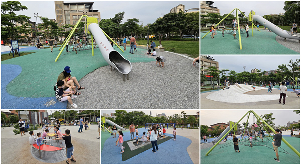 公十二公園(蝴蝶遊戲場)的主題,毛毛蟲變身成蝴蝶,不只遊具是故事的一部分,連涼亭也變成「生態場景」的一環。小朋友跑來跑去玩累了,…