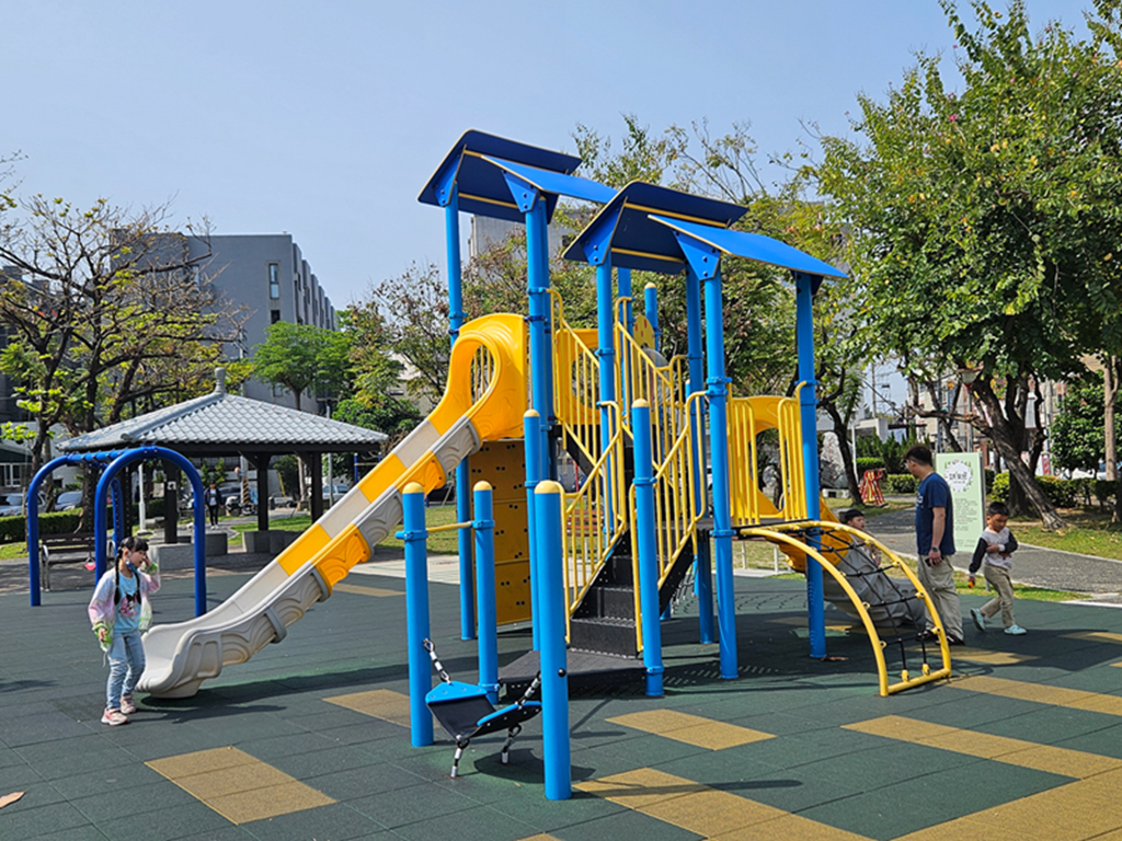 這組多功能遊具藍色跟黃色搭在一起活力滿滿,整個公園瞬間變得很有童話感,溜滑梯是那種長長的「螺紋式」亮面滑道,小朋友滑下來開心,旁邊還有攀岩牆、小橋平台,想爬、想鑽、想跑通通一次滿足