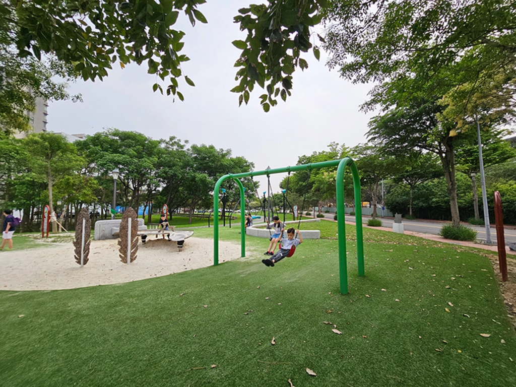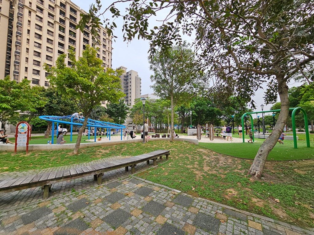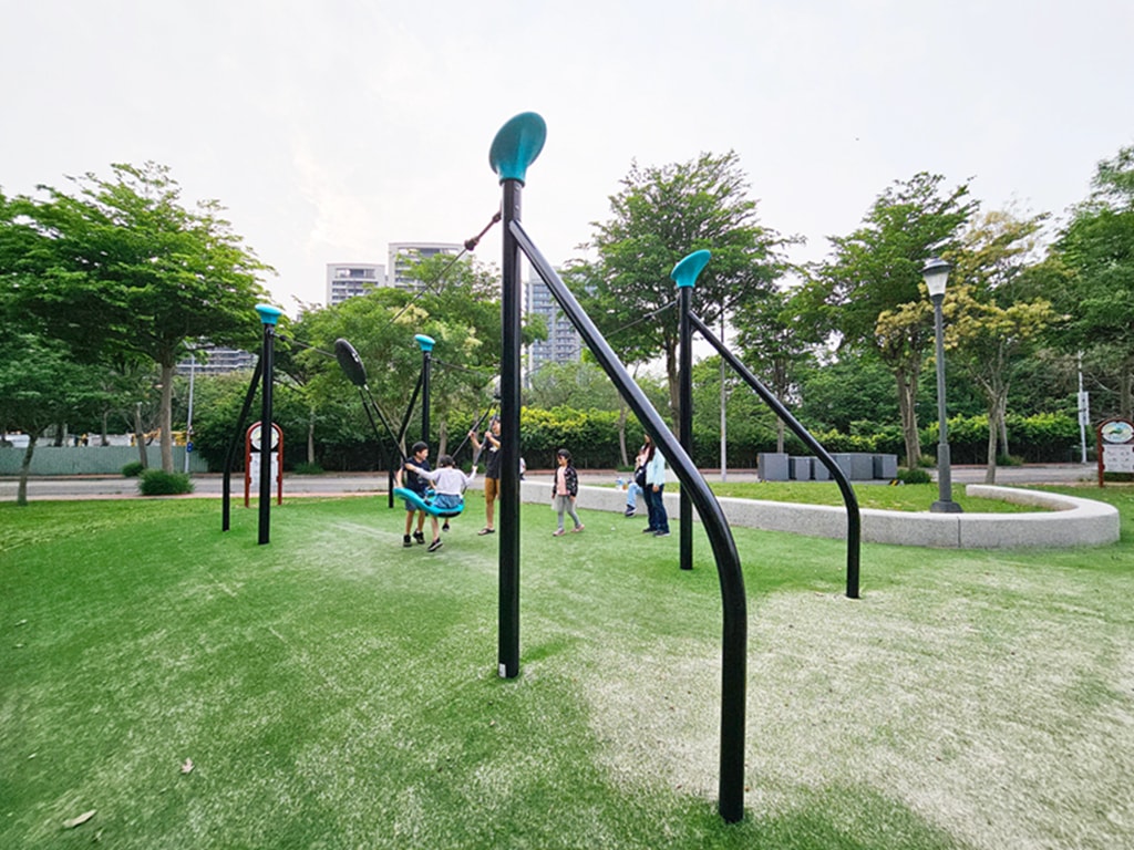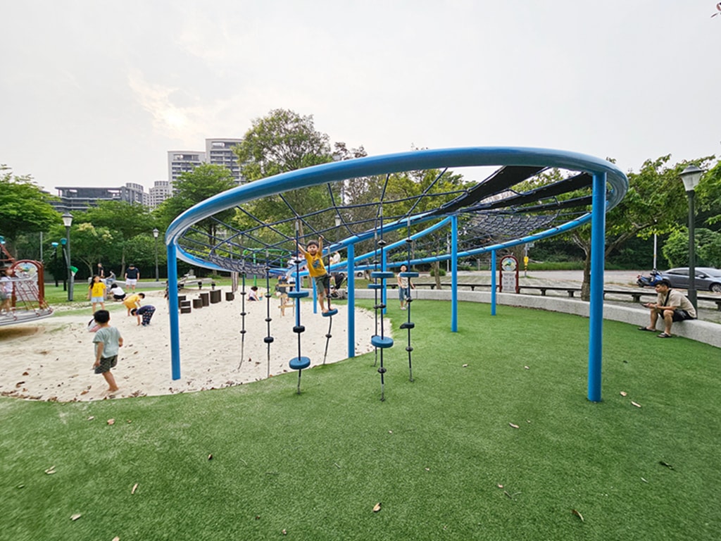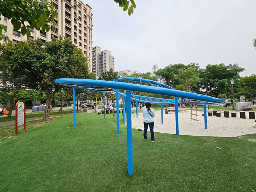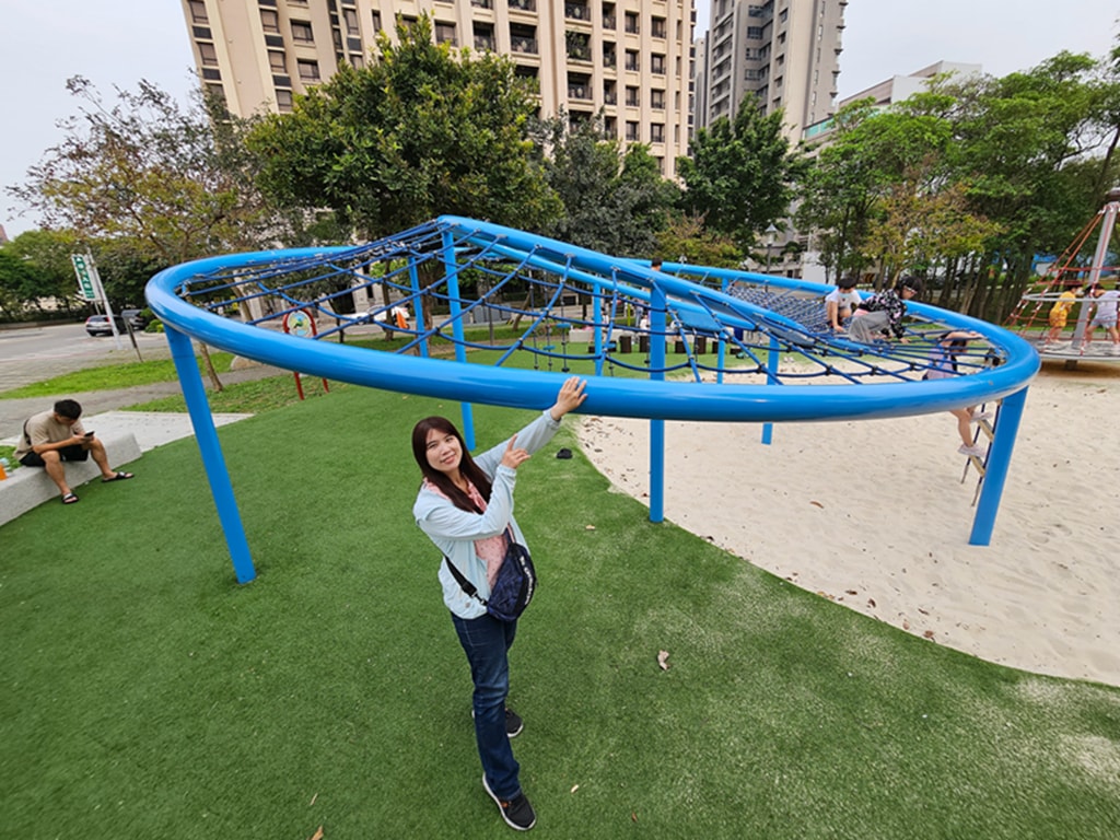 公園最吸睛的就是這個大型藍色攀爬架,造型像隻展翅的五色鳥。孩子們可以爬上去、掛在上面、甚至挑戰手部力量一路移動,玩到笑聲尖叫聲不斷。家長站在下面看,心裡只想著,這電量什麼時候才會耗完啊?