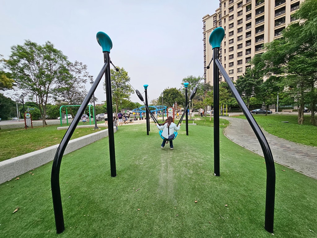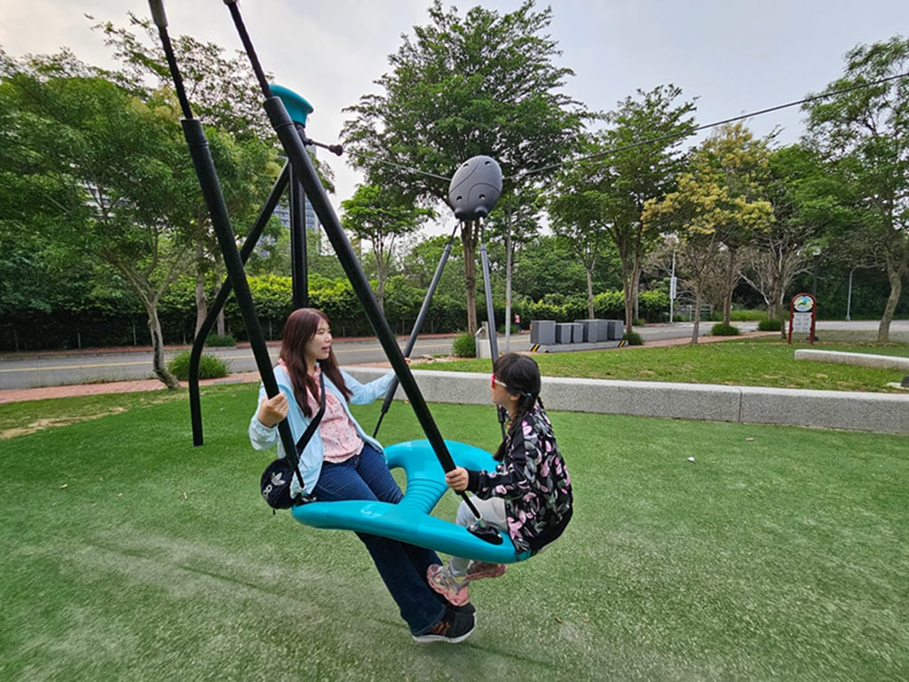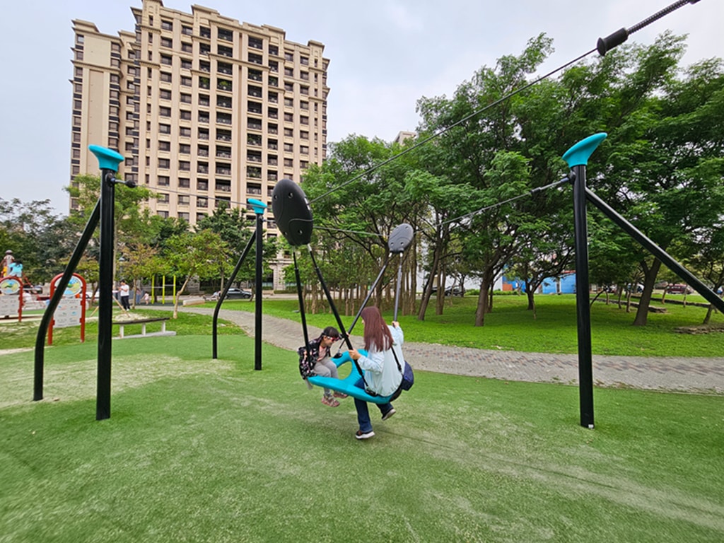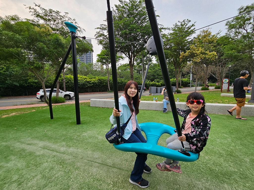 這款超大共融鞦韆,爸媽和小孩可以一起坐,邊盪邊聊天。有人說這是「親子版雲霄飛車」,因為速度快一點就會尖叫,但還是玩到不想下來