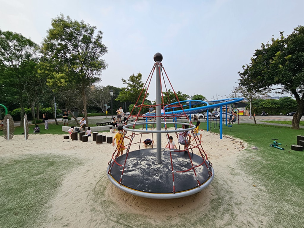 除了藍色攀爬架,公園另一個超人氣設施就是旋轉攀爬塔。看似一座小圓錐,其實能讓孩子們一邊攀爬、一邊隨著塔台旋轉,小孩上去笑得咯咯響,家長看著則覺得這根本是「自走發電機」,玩五分鐘就能耗掉半天電量