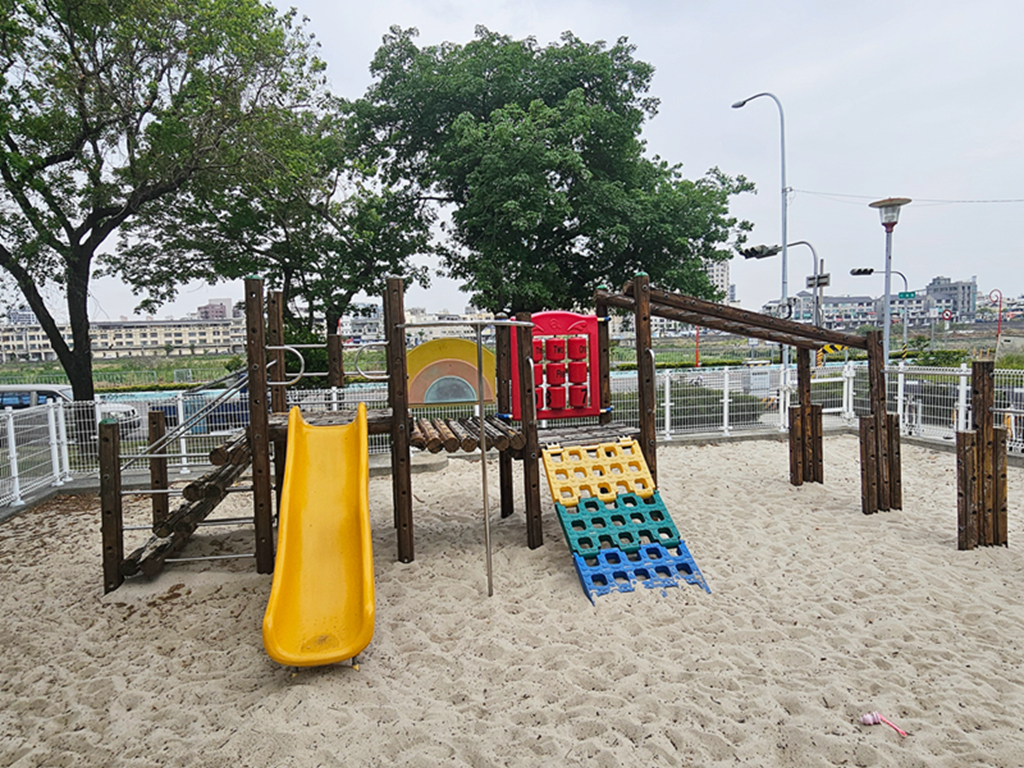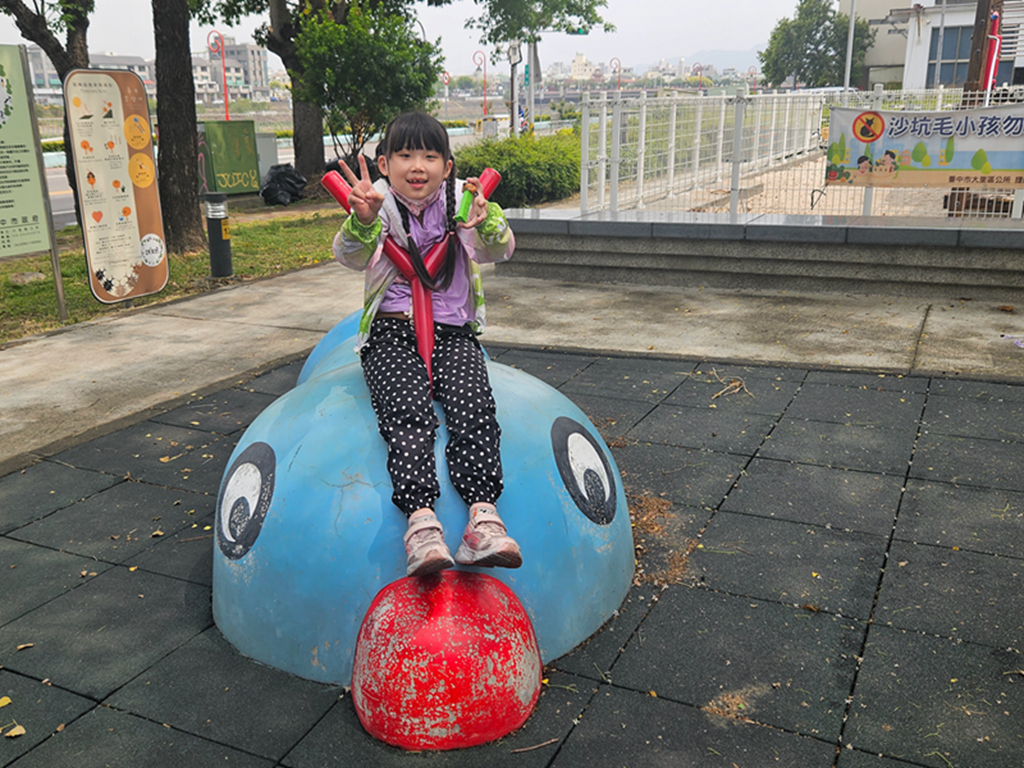 仁堤公園有溜滑梯、有搖搖馬、有寬敞的綠地還有舒服的河堤散步道,完全就是個「小孩放電、大人放鬆」的完美組合