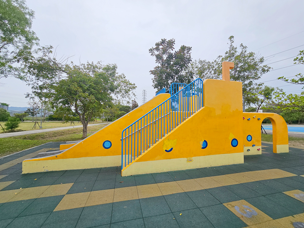 仁化公園潛水艇共融遊戲組公園在 2023 年改造後,裝上了一座超萌的黃色「潛水艇」遊具,裡面有磨石子溜滑梯、攀爬柱、傳聲筒……小朋友可以像潛入海底探險般玩耍